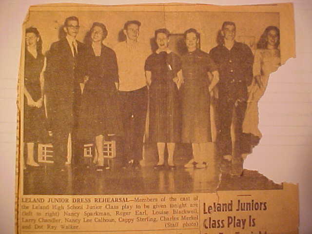 FROM THE LELAND PROGRESS: Leland Juniors Class Play Is Set For Tonight The Leland High School Junior Class Will present its class play "Gone About Girls" at 8:00PM tonight in the W.E. Bufkin Auditorium. The comedy is directed by Miss Shirley Durham and Mrs. Syble Morgan. The cast includes Larry Chandler as a girl-struck boy, Roger Earl as his scholarly father, Louise Blackwell as his mother, Charles Merkel as his friend, Cappy Sterling and Nancy Lee Calhoun as their girl friends, Nancy Sparkman as their teacher and Dot Ray Walker as the girl Larry is struck by. In addition to the play, the Bop Cats, a teen-age band from Leland High, will play. |